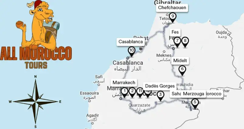 Morocco‘s culture, food, architecture, and traditions have been shaped by a rich history of Berber culture, Islamic conquests, and European colonization. To highlight the very best that Morocco has to offer, a carefully curated itinerary has been designed. From the vibrant and lively souks of the medina with their fragrant spices, to the serene grandeur of the Atlas Mountains, this North African nation has an abundance of sights and experiences to offer. With its varied geography and a unique blend of Arabic-Berber-European culture, this 11 days tour from Marrakech affords the opportunity to explore the country’s 4 imperial cities, mountainous villages, desert landscapes, and coastal ramparts.